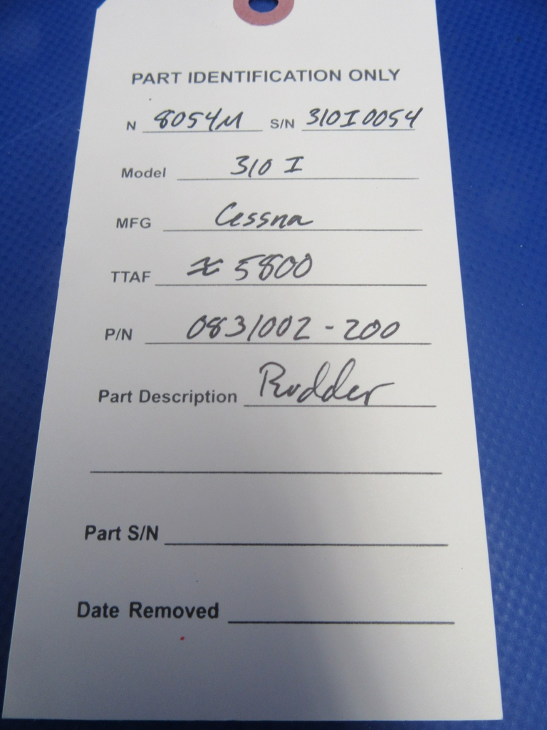 Cessna 310 / 310I Rudder w/o tab P/N 0831002-200. Several minor dings, see photos. Removed from parted-out 1964 Cessna 310I N8054M, S/N 310I0054. Aircraft TT approximately 5800. Guaranteed to pass inspection or your money back.