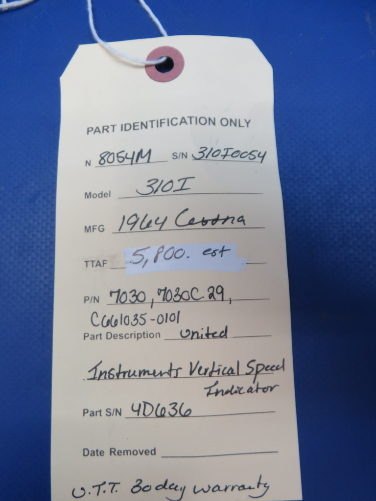 Cessna 310 / 310I United Instruments Vertical Speed Indicator. P/N 7030, 7030C.29, C661035-0101. S/N 40636. We are unable to test this unit, however, we are selling this unit with a 30 day warranty. Removed in good condition from a parted out 1964 Cessna 310I N8054M, S/N 310I0054. Est. TTAF 5,800.0. Guaranteed to pass inspection or your money back.