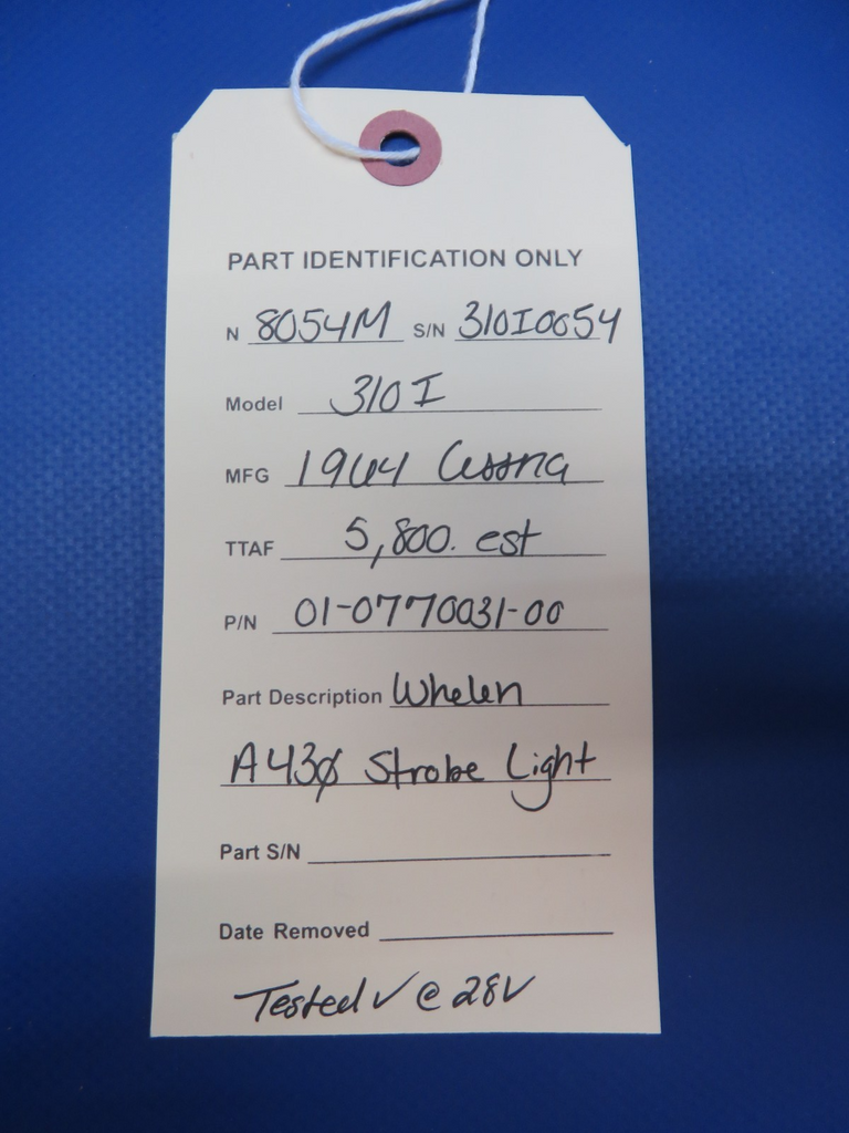 Cessna 310 / 310I Whelen A430 Strobe Light. P/N 01-0770031-00. This item was recently tested at 28v and found to be in working condition. Removed in good condition from a parted out 1964 Cessna 310I N8054M, S/N 310I0054. Est. TTAF 5,800.0. Guaranteed to pass inspection or your money back.