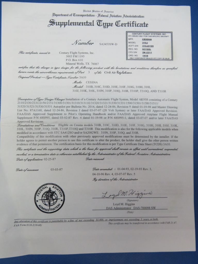 Cessna 310 / 310J Century Autopilot Computer with Rack and Connectors 28v. P/N 10937, 1D937-2150148FF18. S/N 2367C. STC SA3453SW-D. We are unable to test this unit, however, we are selling this unit with a 30 day warranty. Removed in good condition from a parted out 1965 Cessna 310J N3195L, S/N 310J0195. TTAF 4,435.9. Guaranteed to pass inspection or your money back.