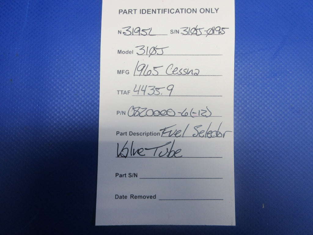 Cessna 310 / 310J Fuel Selector Valve Tube. P/N 0820000-6, 0820000-12. Removed in good condition from a parted out 1965 Cessna 310J N3195L, S/N 310J0195. TTAF 4,435.9. Guaranteed to pass inspection or your money back.