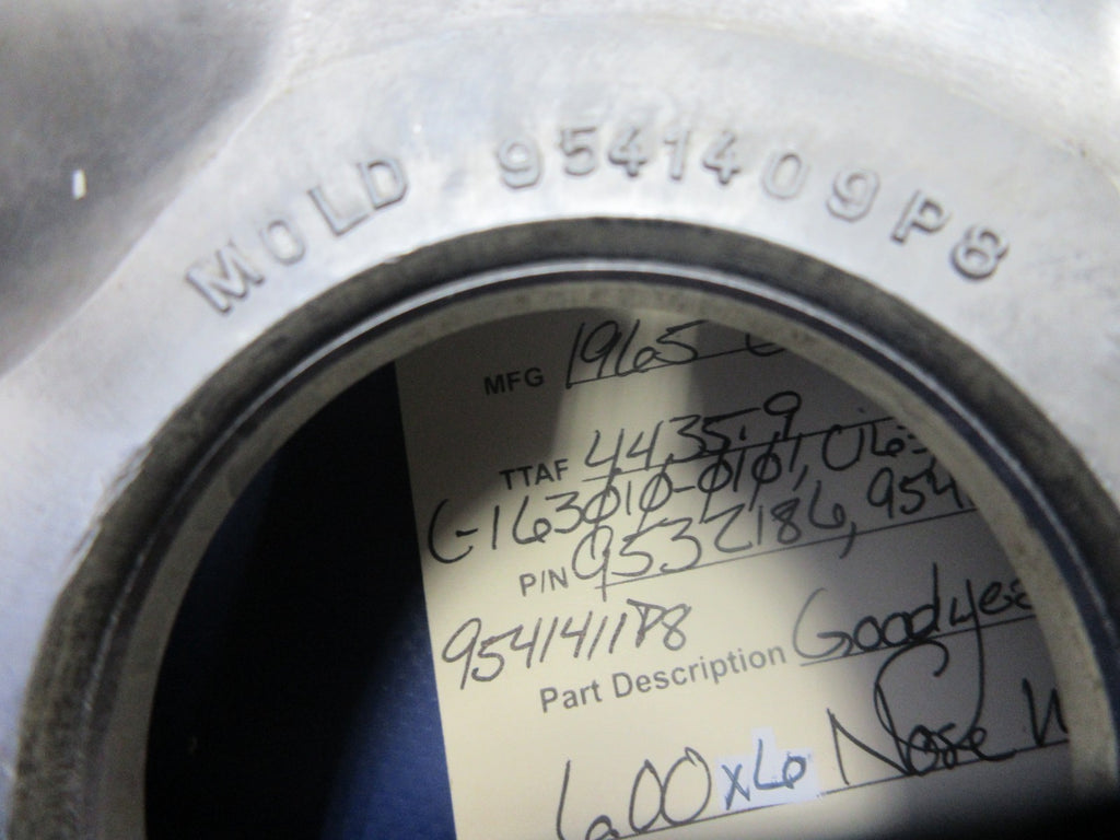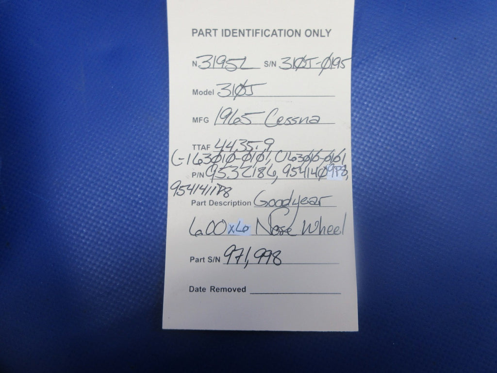 Cessna 310 / 310J Goodyear 6.00 x 6 Nose Wheel. P/N 9532186, 9541409P8, 9541411P8, C-163010-0101, C163010-0101. S/N 971, 998. Removed in good condition from a parted out 1965 Cessna 310J N3195L, S/N 310J0195. TTAF 4,435.9. Guaranteed to pass inspection or your money back.