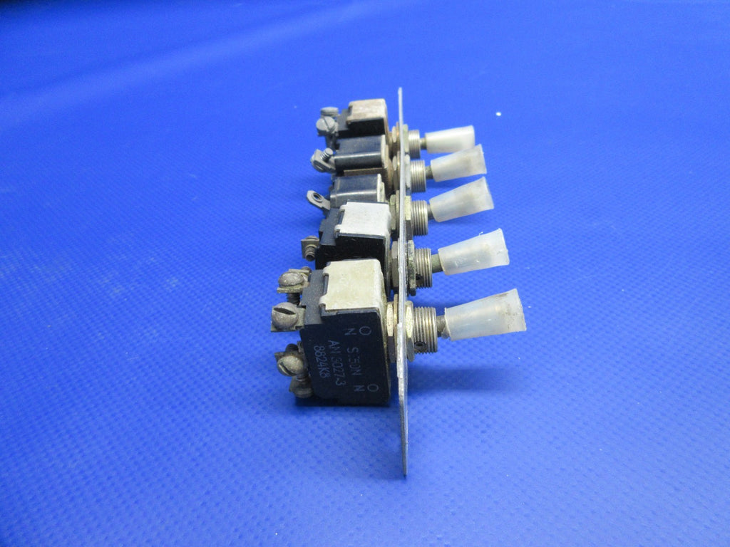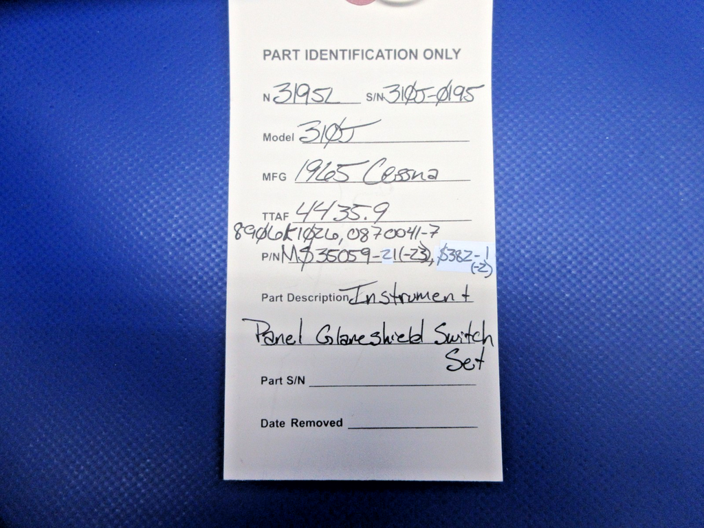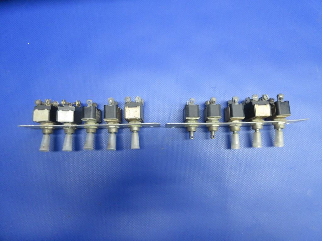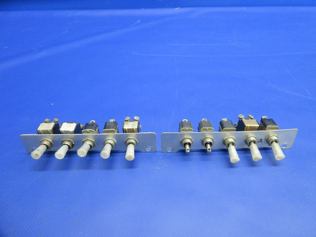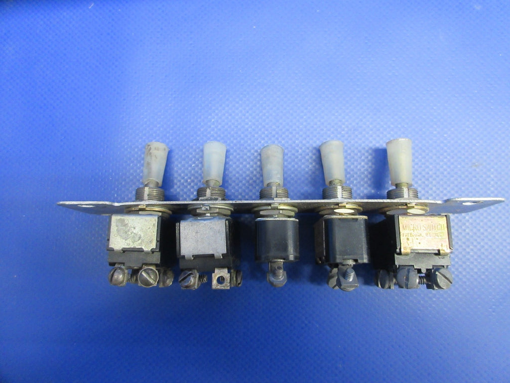 Cessna 310 / 310J Instrument Panel Glareshield Switch Set. P/N MS35059-21, MS35059-23, S382-1, S382-2, 8906K1026, 0870041-7. Removed in good condition from a parted out 1965 Cessna 310J N3195L, S/N 310J0195. TTAF 4,435.9. Guaranteed to pass inspection or your money back.