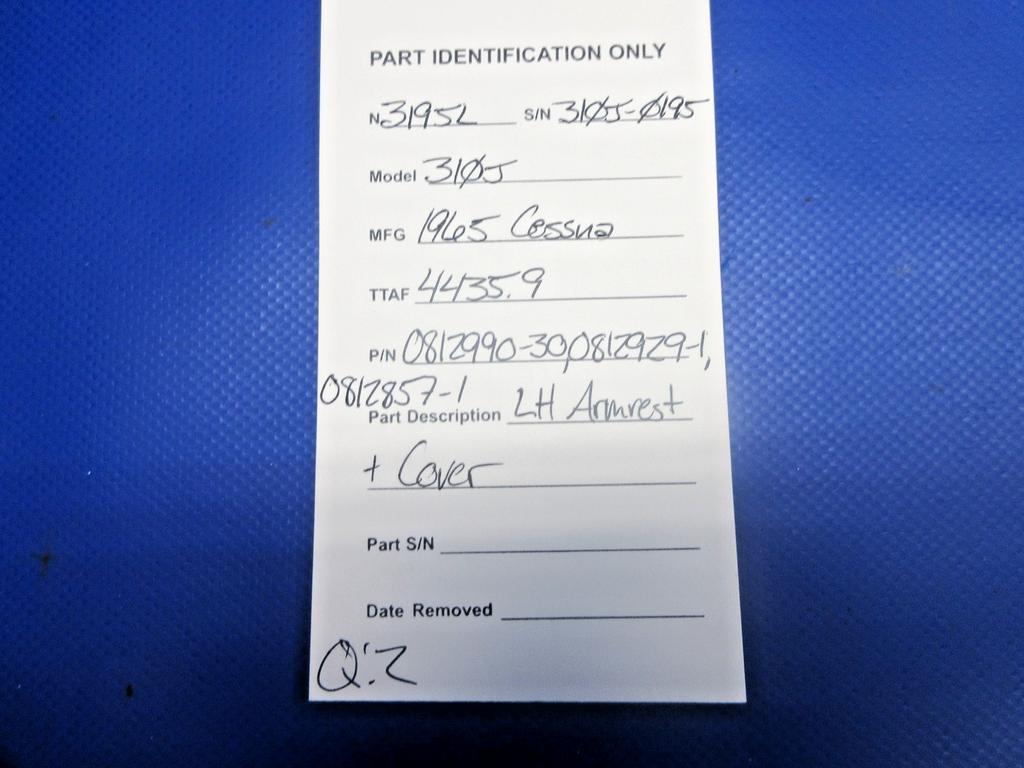 Cessna 310 / 310J Left Hand Armrest & Cover P/N 0812990-30, 0812929-1, 0812857-1. Due to multiple quantities buyer may not receive exact item pictured. Removed in good condition from a parted out 1965 Cessna 310J N3195L, S/N 310J0195. TTAF 4,435.9. Guaranteed to pass inspection or your money back.
