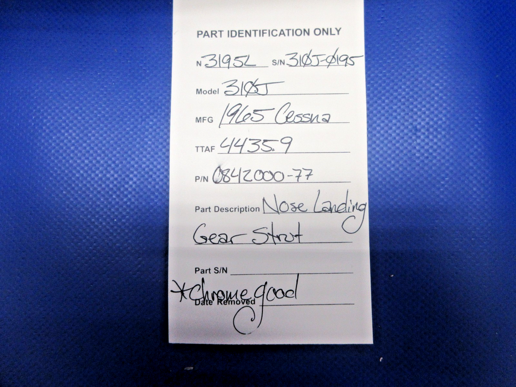 Cessna 310 / 310J Nose Landing Gear Strut. P/N 0842000-77. Chrome Good. Removed in good condition from a parted out 1965 Cessna 310J N3195L, S/N 310J0195. TTAF 4,435.9. Guaranteed to pass inspection or your money back.