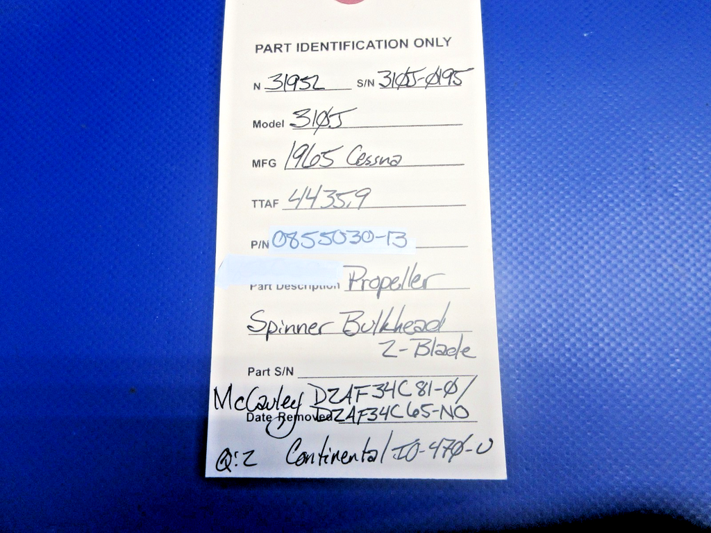 Cessna 310 / 310J Propeller Spinner Bulkhead 2-Blade. P/N 0855030-13. McCauley D2AF34C81-0 / D2AF34C65-NO. Continental IO-470-U. Due to multiple quantities buyer may not receive exact item pictured. Removed in good condition from a parted out 1965 Cessna 310J N3195L, S/N 310J0195. TTAF 4,435.9. Guaranteed to pass inspection or your money back.