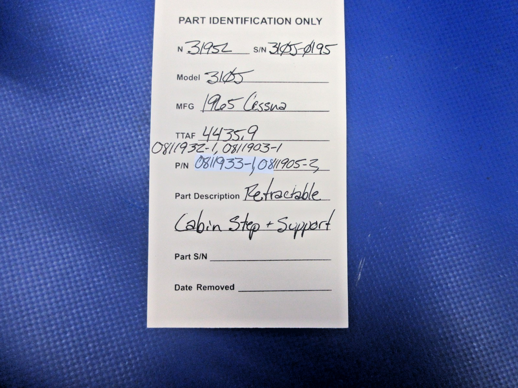 Cessna 310 / 310J Retractable Cabin Step & Support. P/N 0811933-1, 0811905-2, 0811932-1, 0811903-1. Removed in good condition from a parted out 1965 Cessna 310J N3195L, S/N 310J0195. TTAF 4,435.9. Guaranteed to pass inspection or your money back.