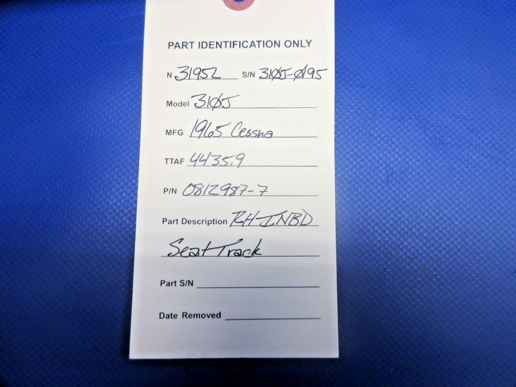 Cessna 310 / 310J Right Hand Inboard Seat Track. P/N 0812987-7. Removed in good condition from a parted out 1965 Cessna 310J N3195L, S/N 310J0195. TTAF 4,435.9. Guaranteed to pass inspection or your money back.