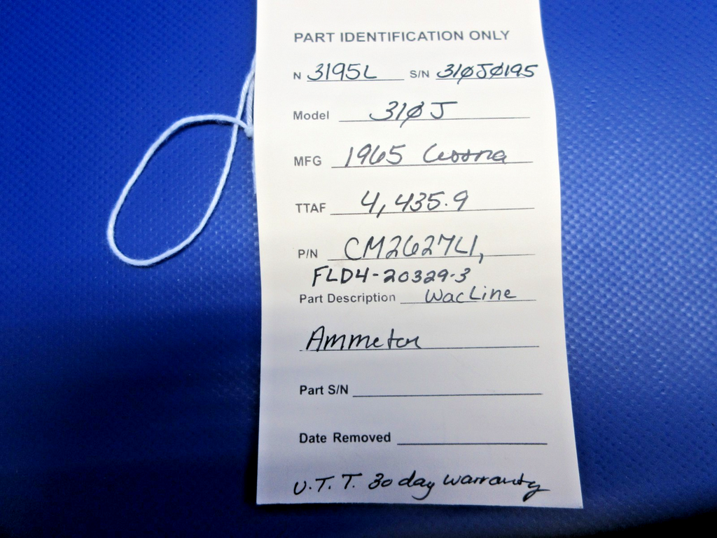 Cessna 310 / 310J Wac Line Ammeter. P/N CM2627LI, FLD4-20329-3. WARRANTY . We are unable to test this unit, however, we are selling this unit this unit with a 30 day warranty. Removed in good condition from a parted out 1965 Cessna 310J N3195L, S/N 310J0195. TTAF 4,435.9. Guaranteed to pass inspection or your money back.