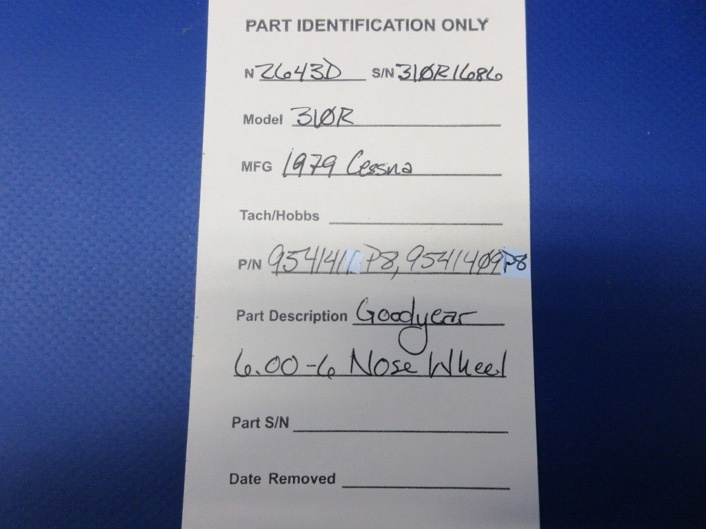 Cessna 310 / 310R Goodyear 6.00-6 Nose Wheel. P/N 9541411P8, 9541409P8. Removed in good condition from a parted out 1979 Cessna 310R N2643D, S/N 310R1686. Guaranteed to pass inspection or your money back.