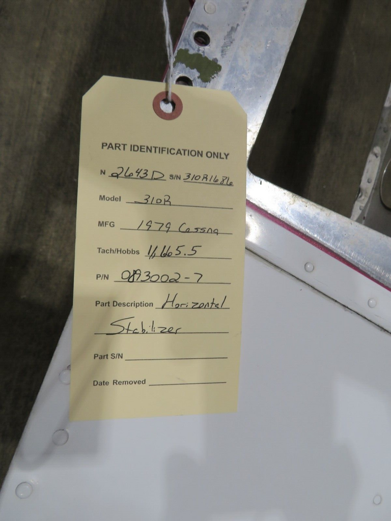 Cessna 310 / 310R Horizontal Stabilizer P/N 0893002-7. No hail damage, boots are nice, no corrosion in or out, very clean. Removed from parted-out 1979 Cessna 310R N2643D, S/N 310R-1686. Aircraft TT 11,665.5. Guaranteed to pass inspection or your money back.