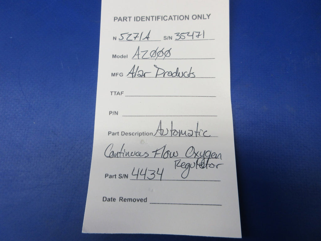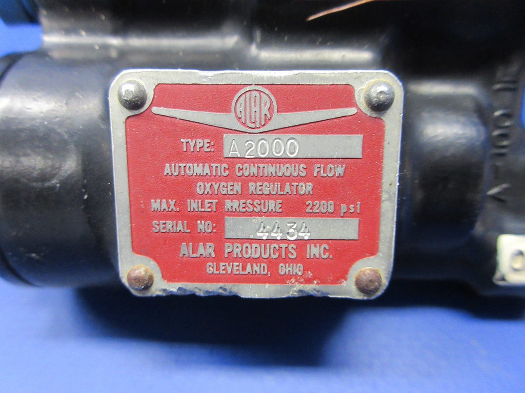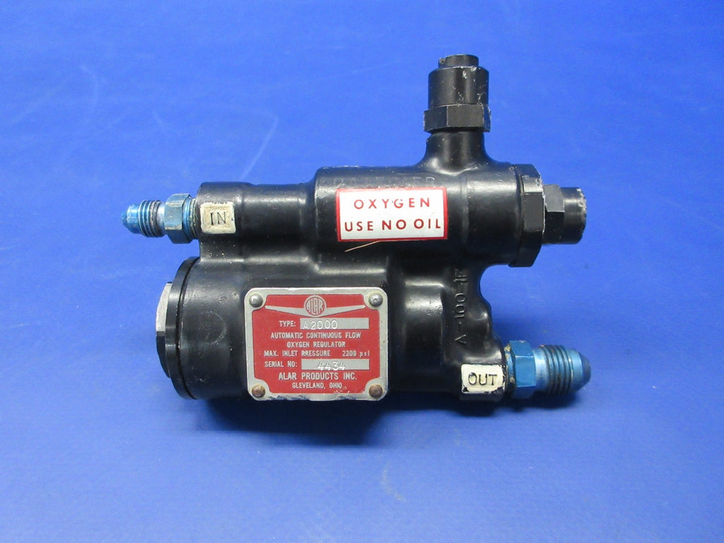 Cessna 310 Alar Products A2000 Automatic Continuous Flow Oxygen Regulator. S/N 4434. Removed in good condition from a parted out 1957 Cessna 310 N5271A, S/N 35471. TTAF 2,830.00. Guaranteed to pass inspection or your money back.