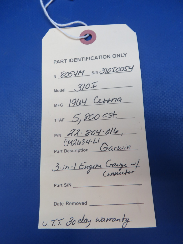Cessna 310 / 310I Garwin 3-in-1 Engine Gauge with Connector. P/N 22-804-016,CM2634-L1. We are unable to test this unit, however, we are selling this unit with a 30 day warranty. Removed in good condition from a parted out 1964 Cessna 310I N8054M, S/N 310I0054. Est. TTAF 5,800.0. Guaranteed to pass inspection or your money back.