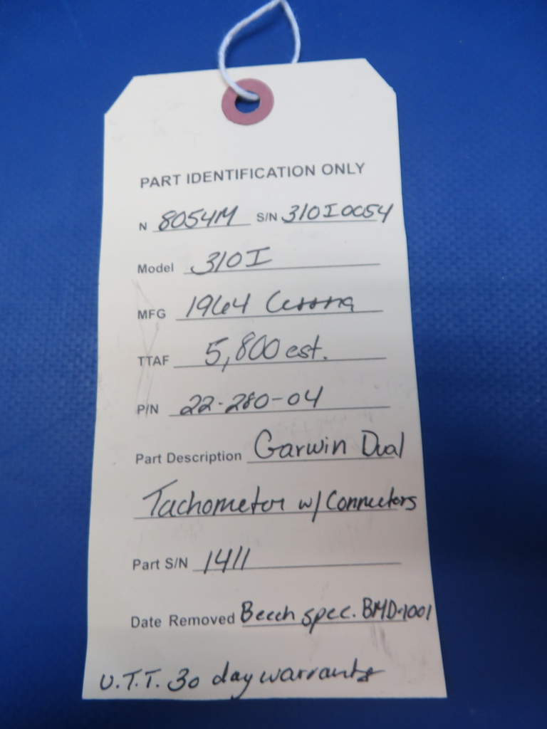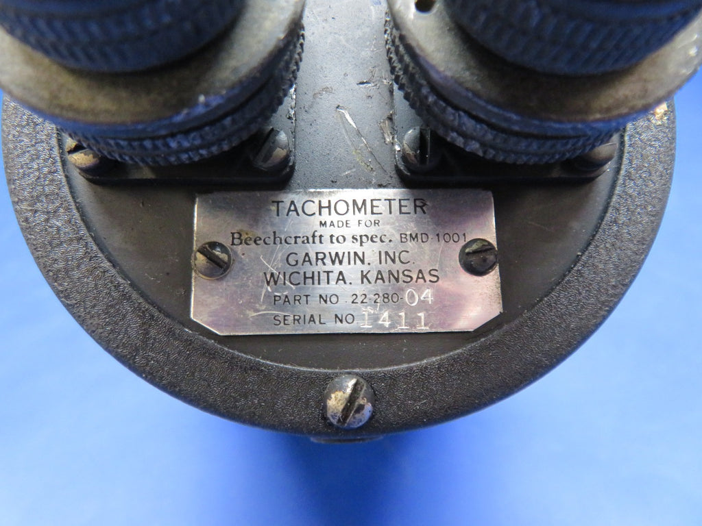 Cessna 310 / 310I Garwin Dual Tachometer w/ Connectors. P/N 22-280-04. S/N 1411. Beech Spec. BMD-1001. We are unable to test this unit, however, we are selling this unit a 30 day warranty. Removed in good condition from a parted out 1964 Cessna 310I N8054M, S/N 310I0054. Est. TTAF 5,800.0. Guaranteed to pass inspection or your money back.