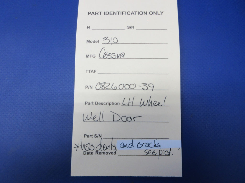 Cessna 310 Left Hand Wheel Well Door. P/N 0826000-39. Has dents and cracks, see pictures. Guaranteed to pass inspection or your money back.