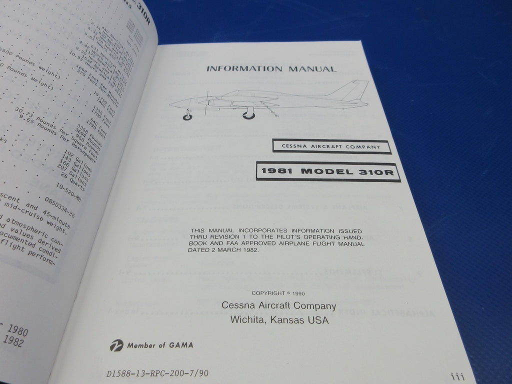 Cessna 310R Information Manual 1981. P/N D1588-13. NEW OLD STOCK. No paperwork. Guaranteed to pass inspection or your money back.