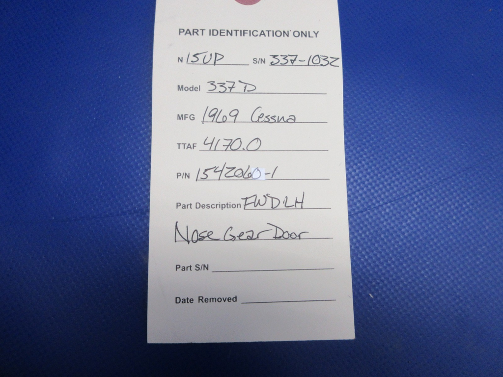Cessna 337 / 337D Skymaster Forward Left Hand Nose Gear Door. P/N 1542060-1. Removed in good condition from a parted out 1969 Cessna 337D Skymaster N15UP, S/N 337-1032. TTAF 4170.0. Guaranteed to pass inspection or your money back.