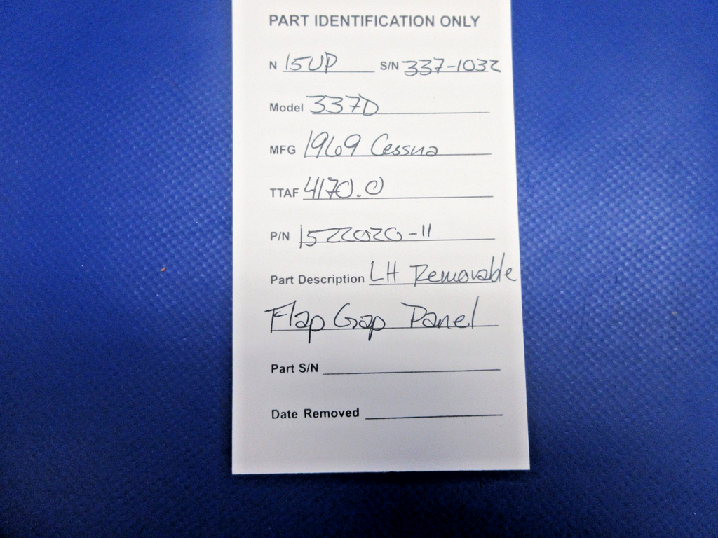Cessna 337 / 337D Skymaster Left Hand Removable Flap Gap Panel. P/N 1522020-11. Removed in good condition from a parted out 1969 Cessna 337D Skymaster N15UP, S/N 337-1032. TTAF 4170.0. Guaranteed to pass inspection or your money back.
