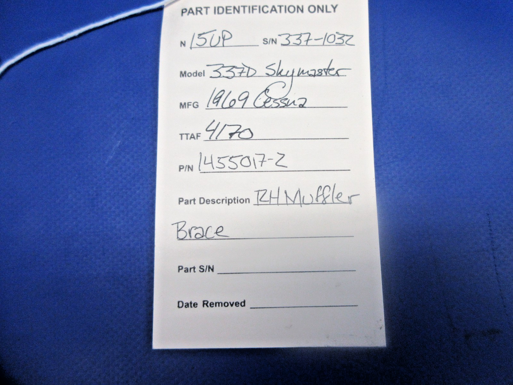 Cessna 337 / 337D Skymaster Right Hand Muffler Brace. P/N 1455017-2. Removed in good condition from a parted out 1969 Cessna 337D Skymaster N15UP, S/N 337-1032. TTAF 4170.0. Guaranteed to pass inspection or your money back.