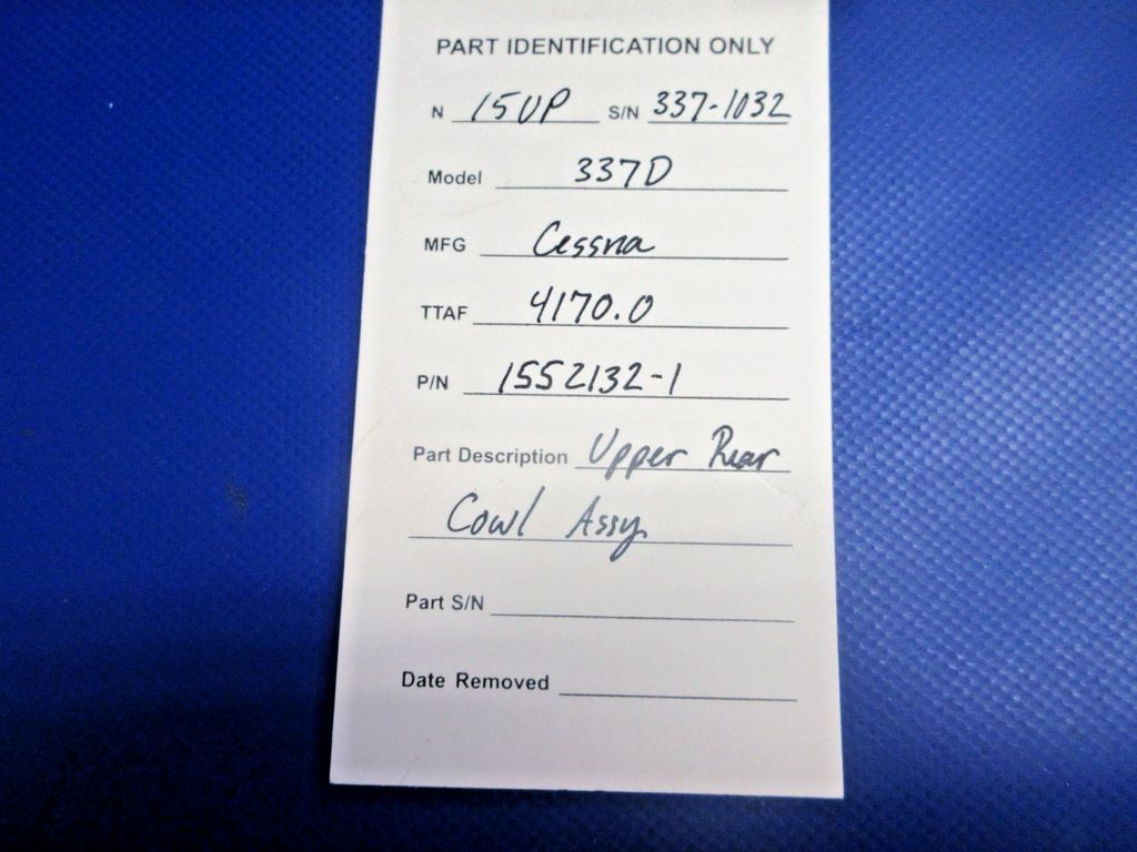 Cessna 337 / 337D Skymaster Upper Rear Cowl Assembly. P/N 1552132-1. Removed in good condition from a parted out 1969 Cessna 337D Skymaster N15UP, S/N 337-1032. TTAF 4170.0. Guaranteed to pass inspection or your money back.
