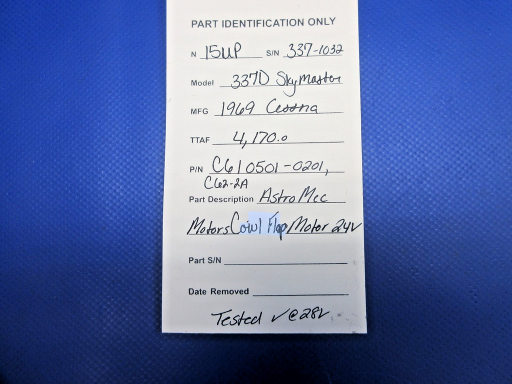 Cessna 337 / 337D Skymaster Astro Mec Motors Cowl Flap Motor 24 Volt. P/N C610501-0201, C62-2A. TESTED at 28 Volts. This item was recently tested and found to be in working condition. Removed in good condition from a parted out 1969 Cessna 337D Skymaster N15UP, S/N 337-1032. TTAF 4170.0. Guaranteed to pass inspection or your money back.