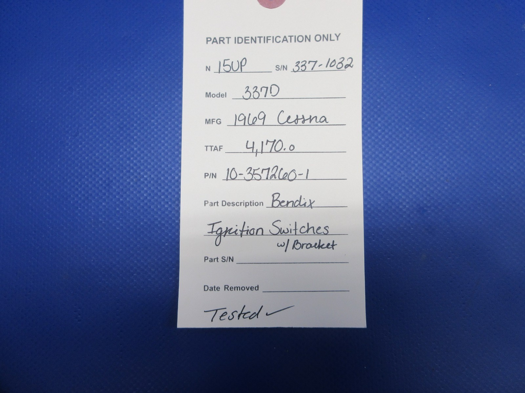 Cessna 337 / 337D Bendix Ignition Switches With Bracket. P/N 10-357260-1. TESTED. This item was recently tested and found to be in working condition. Removed in good condition from a parted out 1969 Cessna 337D Skymaster N15UP, S/N 337-1032. TTAF 4170.0. Guaranteed to pass inspection or your money back.