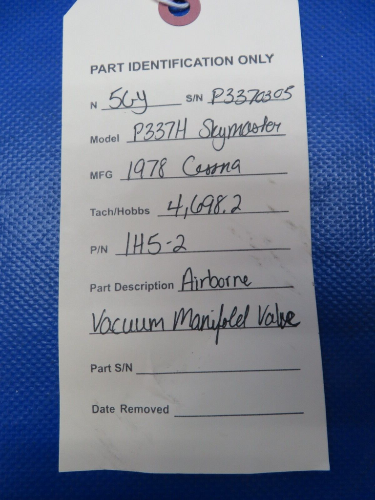 Cessna 337 / P337H Skymaster Airborne Vacuum Manifold Valve. P/N 1H5-2. Removed in good condition from a parted out 1978 Cessna P337H Skymaster N5GY, S/N P3370305. TTAF 4,698.2. Guaranteed to pass inspection or your money back.