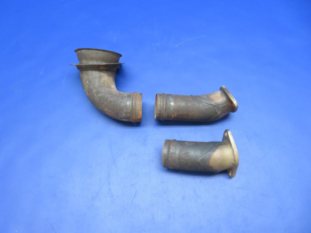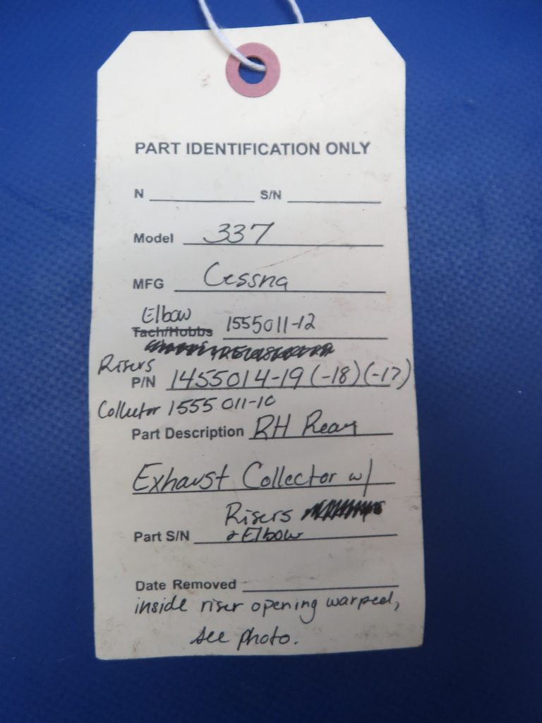 Cessna 337 Right Hand Rear Exhaust Collector with Risers and Elbow. P/N (Elbow) 1555011-12, ( Risers) 1455014-19, 1455014-18, 1455014-17, (Collector) 1555011-10. Inside riser opening is warped. Guaranteed to pass inspection or your money back.