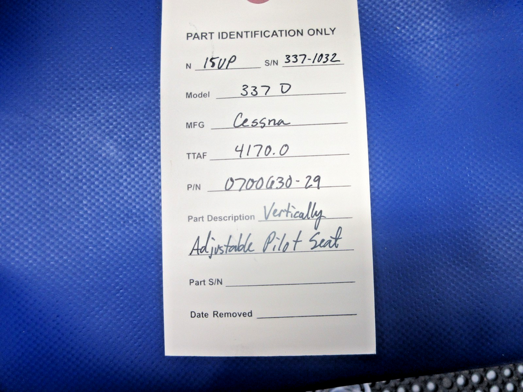 Cessna 337 / 337D Skymaster Infinite Adjust Pilot Seat. P/N 1514232-12. Light Blue Tweed. Removed in good condition from a parted out 1969 Cessna 337D Skymaster N15UP, S/N 337-1032. TTAF 4170.0. Guaranteed to pass inspection or your money back.