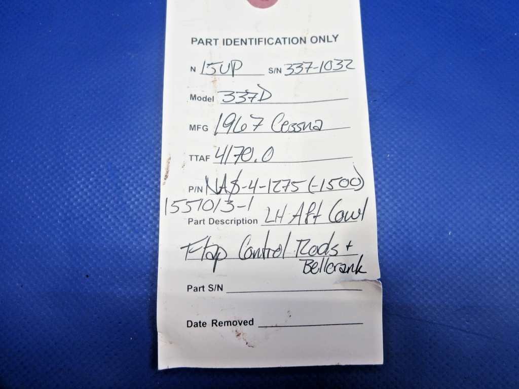 Cessna 337 / 337D Skymaster Left Hand AFT Cowl Flap Control Rods & Bellcrank. P/N NAS-4-1275, NAS-4-1500, 1551013-1. Removed in good condition from a parted out 1969 Cessna 337D Skymaster N15UP, S/N 337-1032. TTAF 4170.0. Guaranteed to pass inspection or your money back.