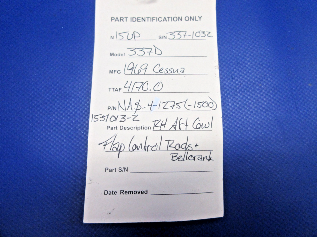 Cessna 337 / 337D Skymaster Right Hand AFT Cowl Flap Control Rods & Bellcrank. P/N NAS-4-1275, NAS-4-1500, 1551013-2. Removed in good condition from a parted out 1969 Cessna 337D Skymaster N15UP, S/N 337-1032. TTAF 4170.0. Guaranteed to pass inspection or your money back.