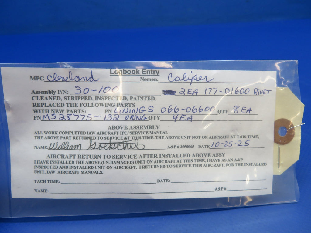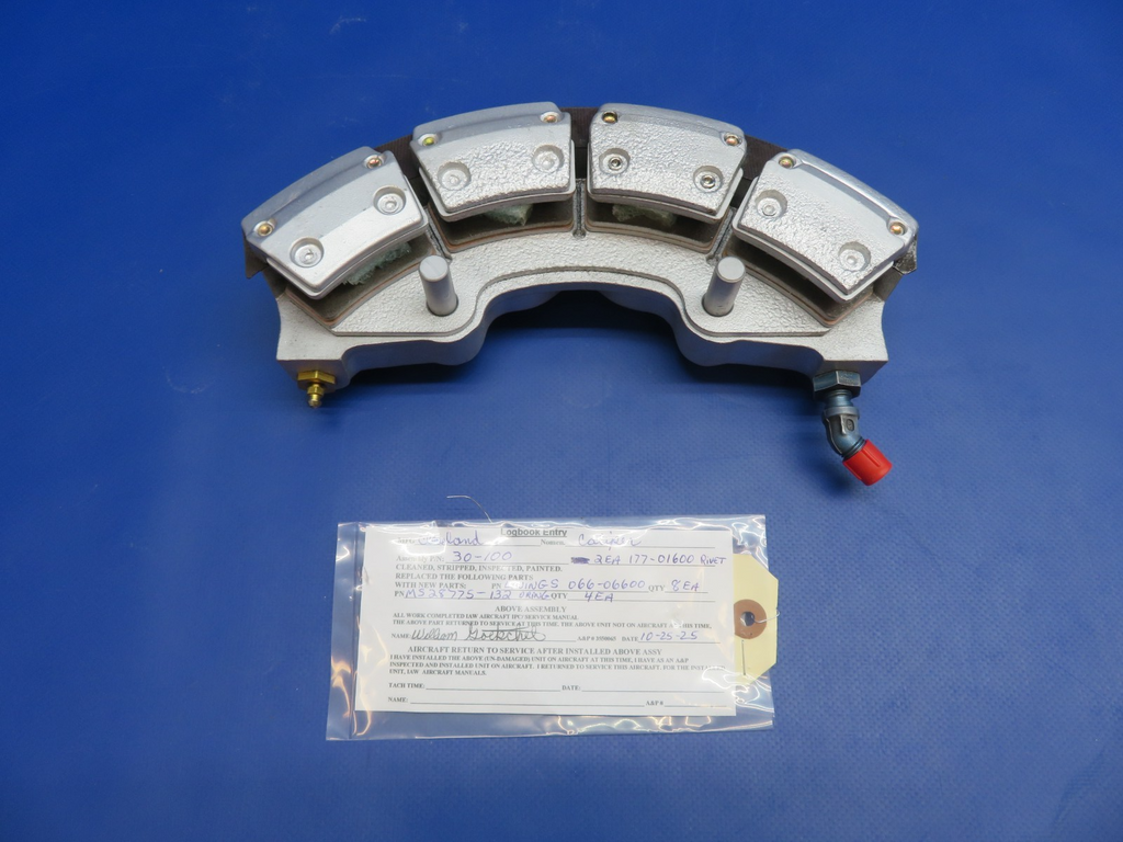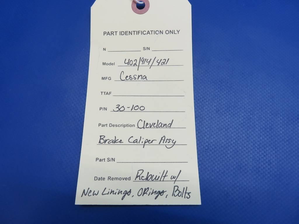 Cessna 402 / 414 / 421 Cleveland Brake Caliper Assembly. P/N 30-100. REBUILT with New Linings, New O-Rings, New Bolt Kit, and 2 New Rivets. Guaranteed to pass inspection or your money back.