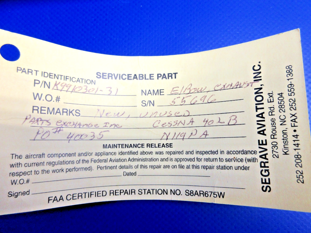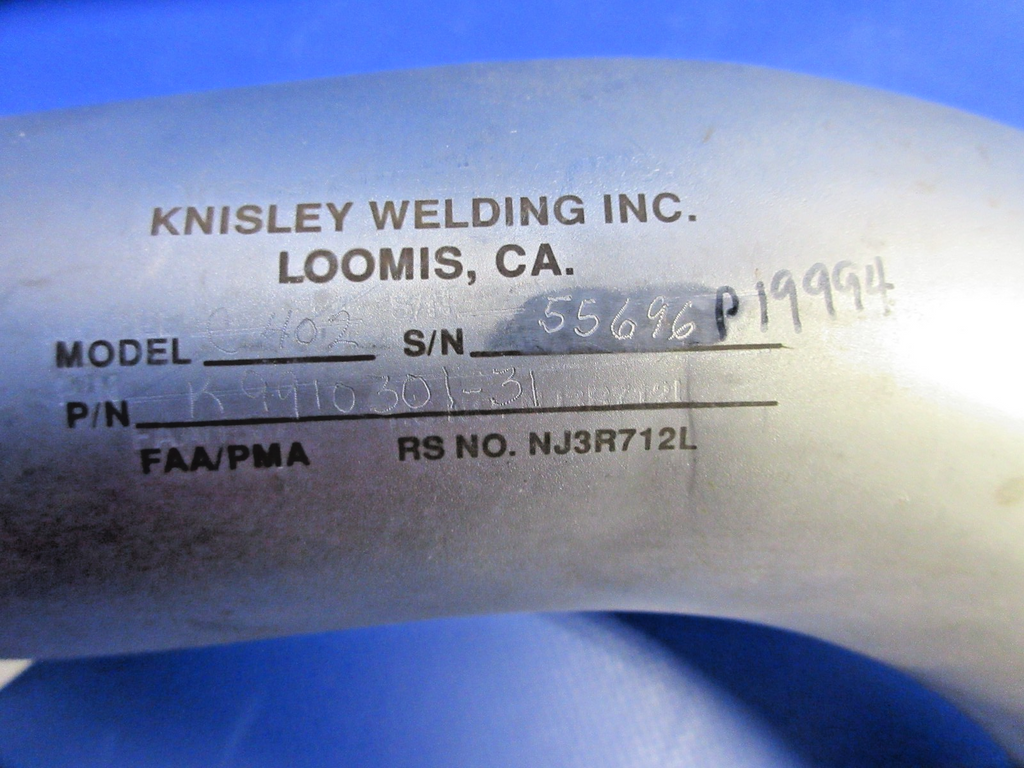 Cessna 402B Knisley Left Hand Outboard Exhaust Stack With Yellow Tag. P/N 9910301-31, 9910301-1,