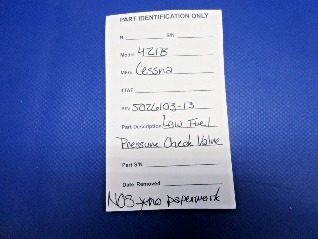 Cessna 421B Low Fuel Pressure Check Valve. P/N 5026103-13. NEW OLD STOCK. No Paperwork. Guaranteed to pass inspection or your money back.