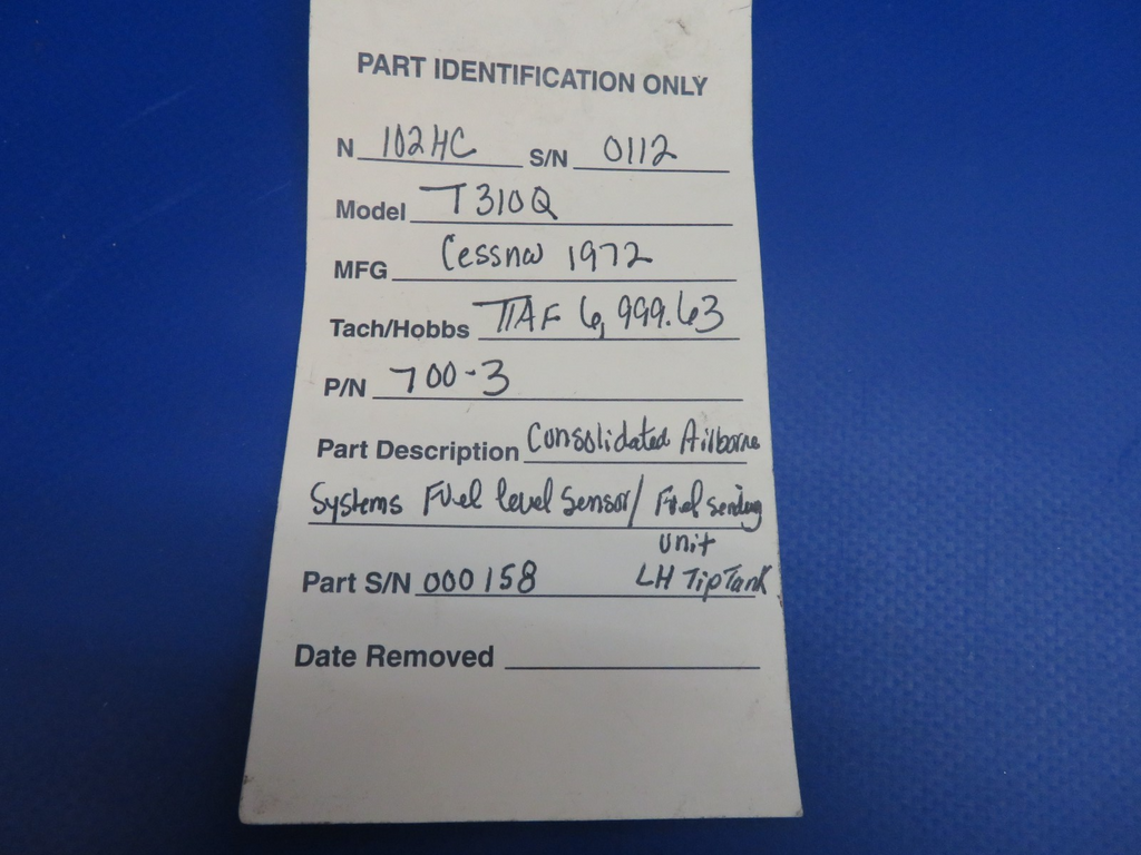Cessna 310 / T310Q Consolidated Airborne Systems Fuel Level Sender / Fuel Sending Unit. Removed from Left Hand Tip Tank. P/N 700-3. S/N 000158. This item was recently tested and found to be in working condition. Removed in good condition from a parted out 1972 Cessna T310Q N102HC, S/N 0112. TTAF 6,999.63. Guaranteed to pass inspection or your money back.