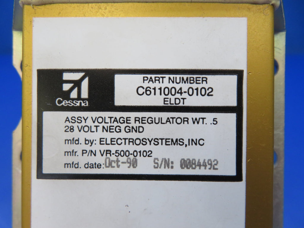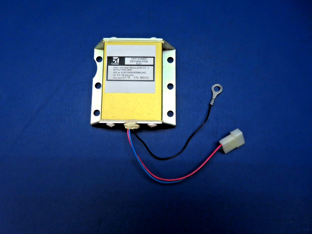 Cessna Electrosystems Voltage Regulator 28v. P/N C611004-0102, VR-500-0102. S/N 0084492. This item was recently tested at 28v and found to be in working condition. Guaranteed to pass inspection or your money back.