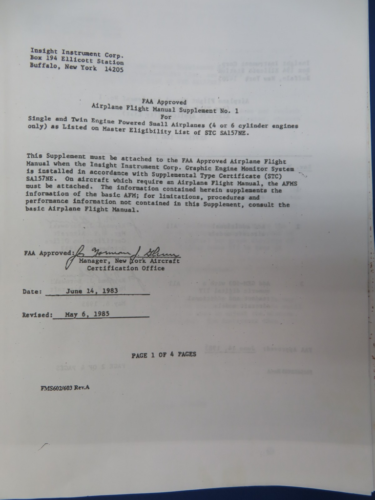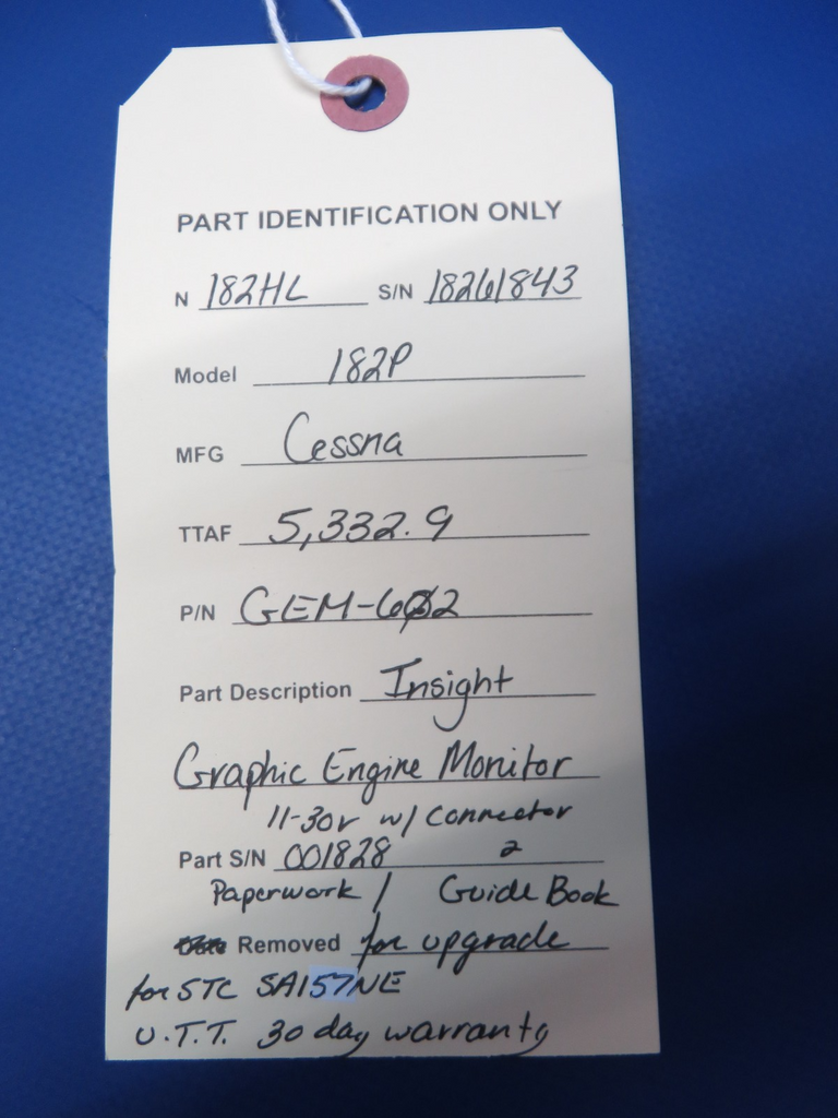 Cessna 182 / 182L Insight Graphic Engine Monitor with Connector and Guide book / Paperwork 11-30v. P/N GEM-602. S/N 001828. For STC SA157NE. We are unable to test this unit, however, we are selling this unit with a 30 day warranty. Removed for upgrade in good condition from a Cessna 182P N182HL, S/N 182611843. TTAF 5,332.9. Guaranteed to pass inspection or your money back.