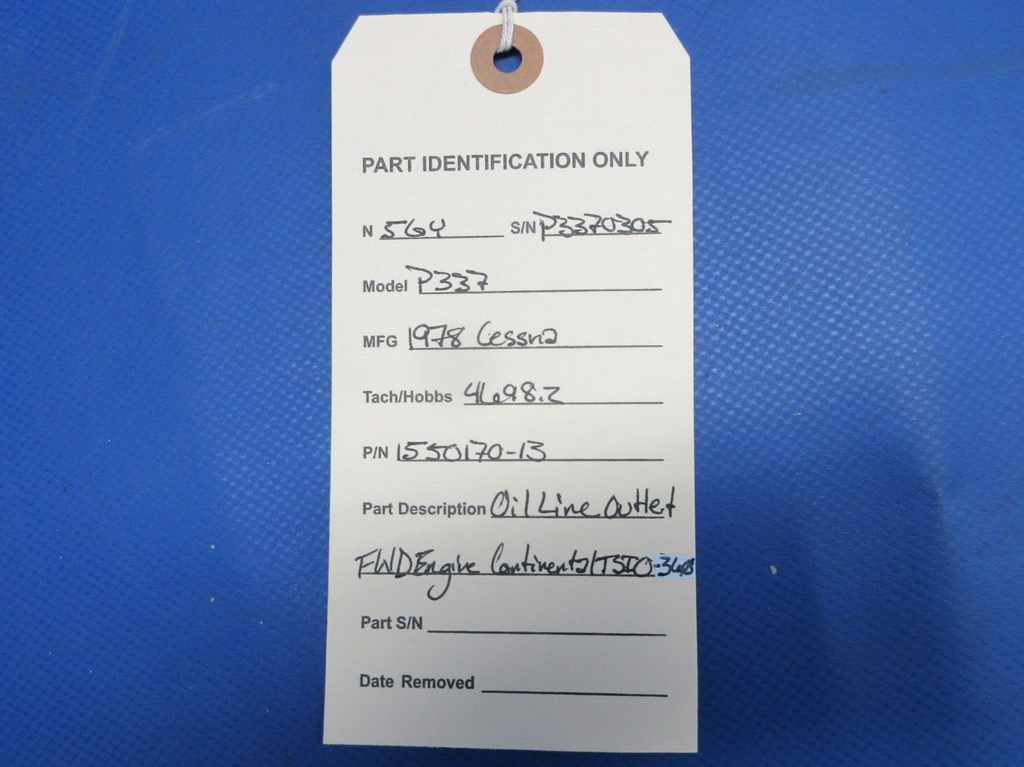 Cessna P337H Skymaster Oil Line Outlet Forward Engine Continental TSIO-360. P/N 1550170-13. Removed in good condition from a parted out 1978 Cessna P337H Skymaster N5GY, S/N P3370305. TTAF 4,698.2. Guaranteed to pass inspection or your money back.