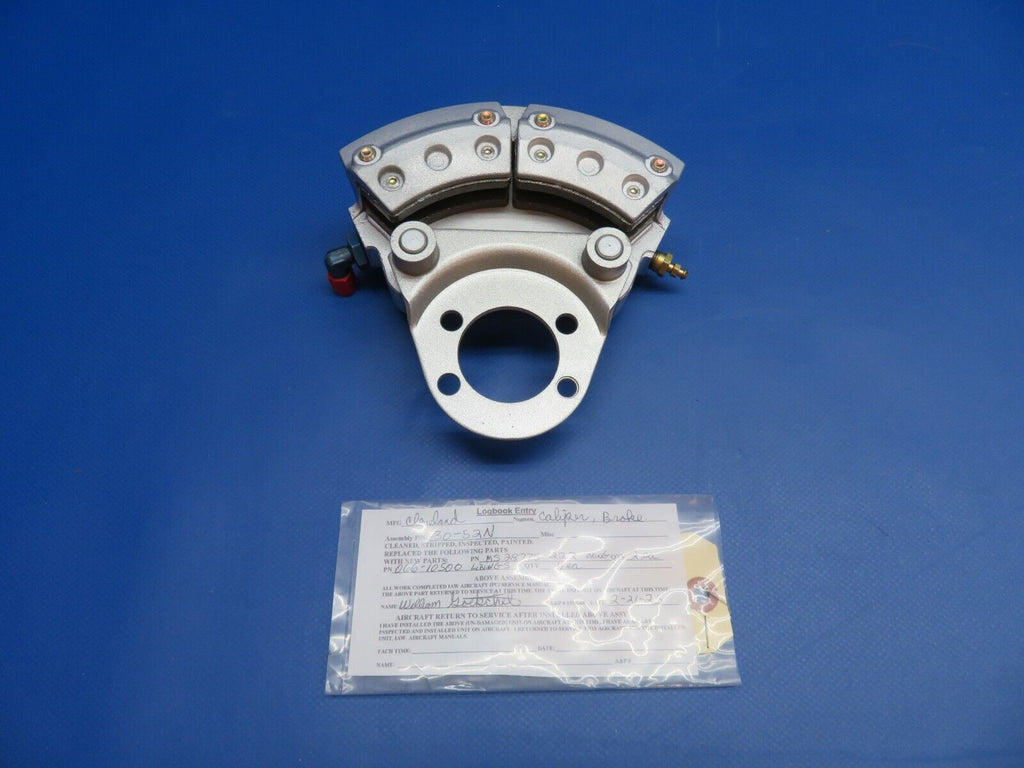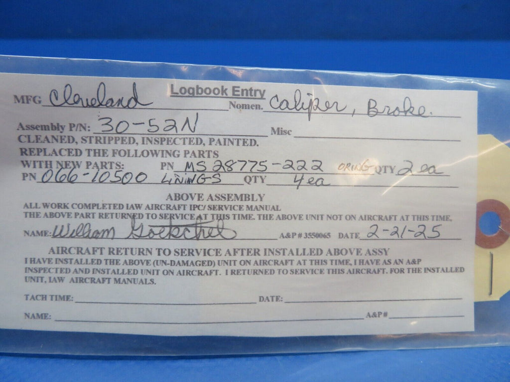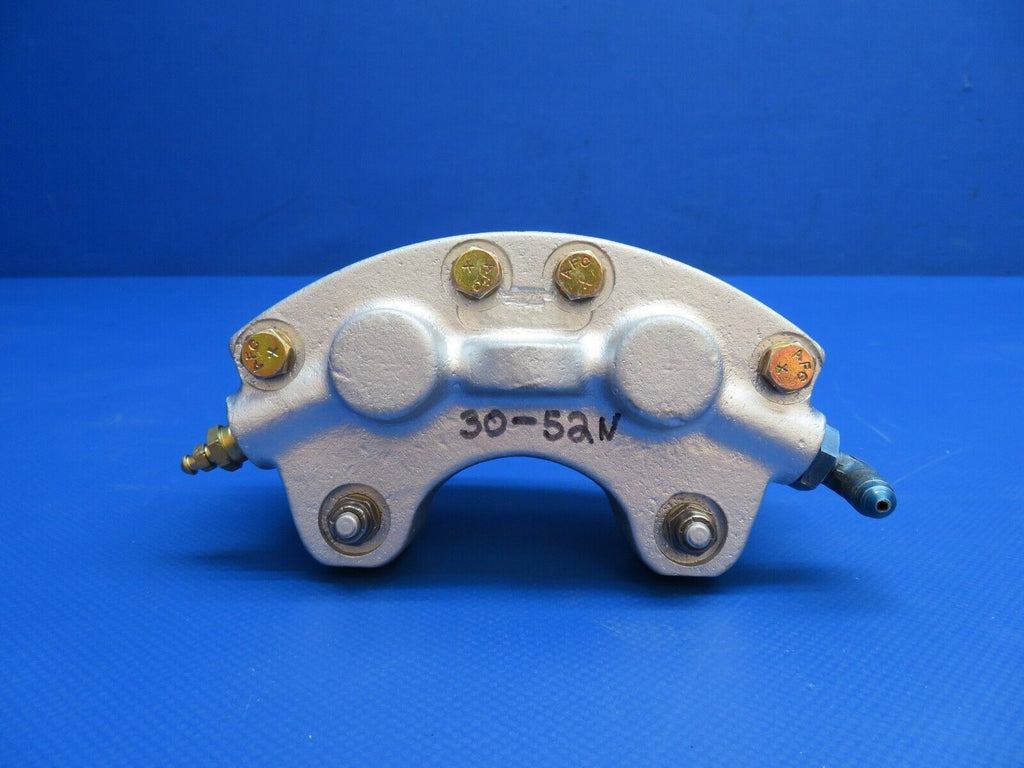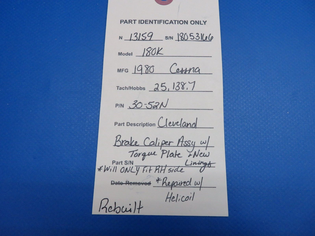 Cleveland Right Hand Brake Caliper Assembly with New Linings and Torque Plate. REBUILT. P/N 30-52N. Fits Right Hand side ONLY. The brake line fitting was pipe thread originally matching the bleeder fitting. This allowed the housing to be used in the LH or RH position. The repair removed the pipe threads, installed a straight thread helicoil, and now uses an AN fitting utilizing an O-ring. So, now it can be used in the RH position only. Priced accordingly.