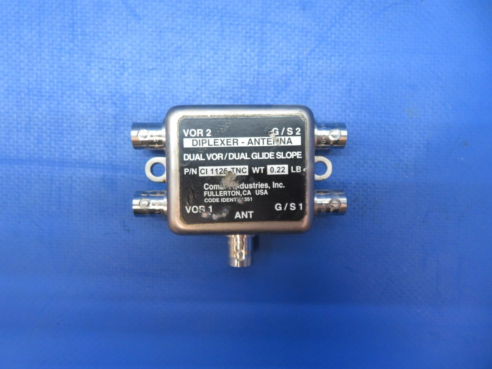 Comant Industries Diplexer Antenna. P/N CI-1125 TNC. S/N 322634. Removed in good condition from a parted out 1968 Piper PA-28-140 N5740F, S/N 28-25042. TTAF 3,616.3. Guaranteed to pass inspection or your money back.