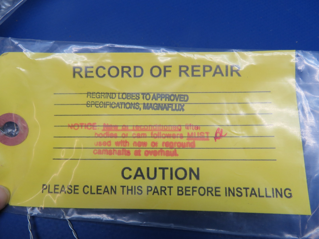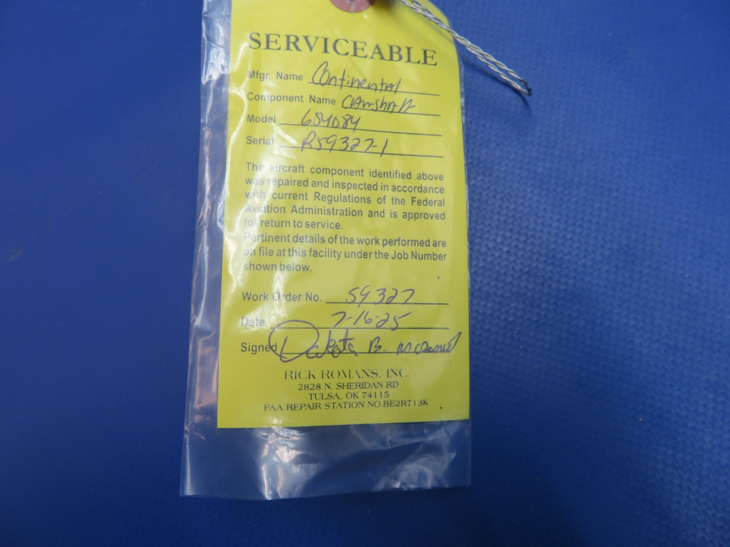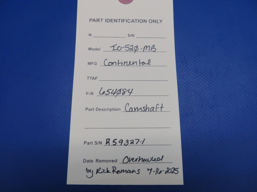 Continental IO-520 / IO-520-MB Camshaft. P/N 654084. S/N R59327-1. OVERHAULED by Rick Romans on 7/16/2025. Guaranteed to pass inspection or your money back.