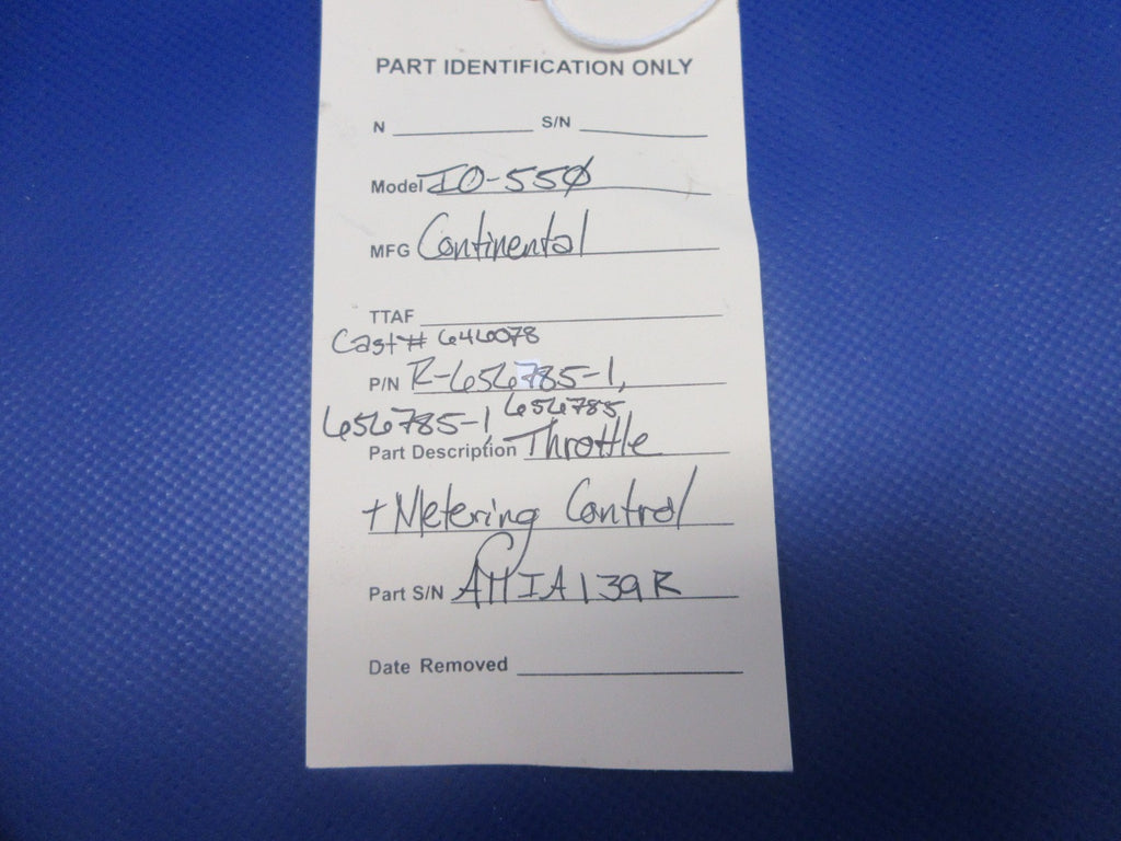 Continental IO-550 Throttle & Metering Control. P/N R-656785-1, 656785-1, 656785, Casting # 646078. S/N A11IA139R. Guaranteed to pass inspection or your money back.