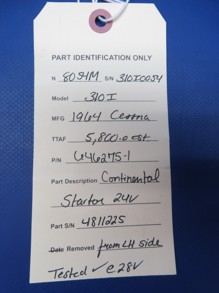 Cessna 310 / 310I Continental Starter 24v. P/N 646275-1. S/N 4811225. Removed from the left side. This item was recently tested at 28v and found to be in working condition. Removed in good condition from a parted out 1964 Cessna 310I N8054M, S/N 310I0054. Est. TTAF 5,800.0. Guaranteed to pass inspection or your money back.