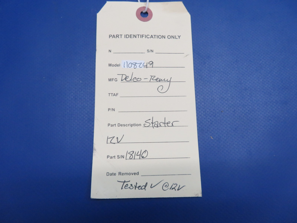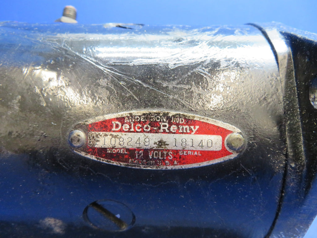 Delco-Remy Starter. 12 Volts. Model 1108249. S/N 18140. This item was recently bench tested at 12 Volts and found to be in working condition. Guaranteed to pass inspection or your money back.