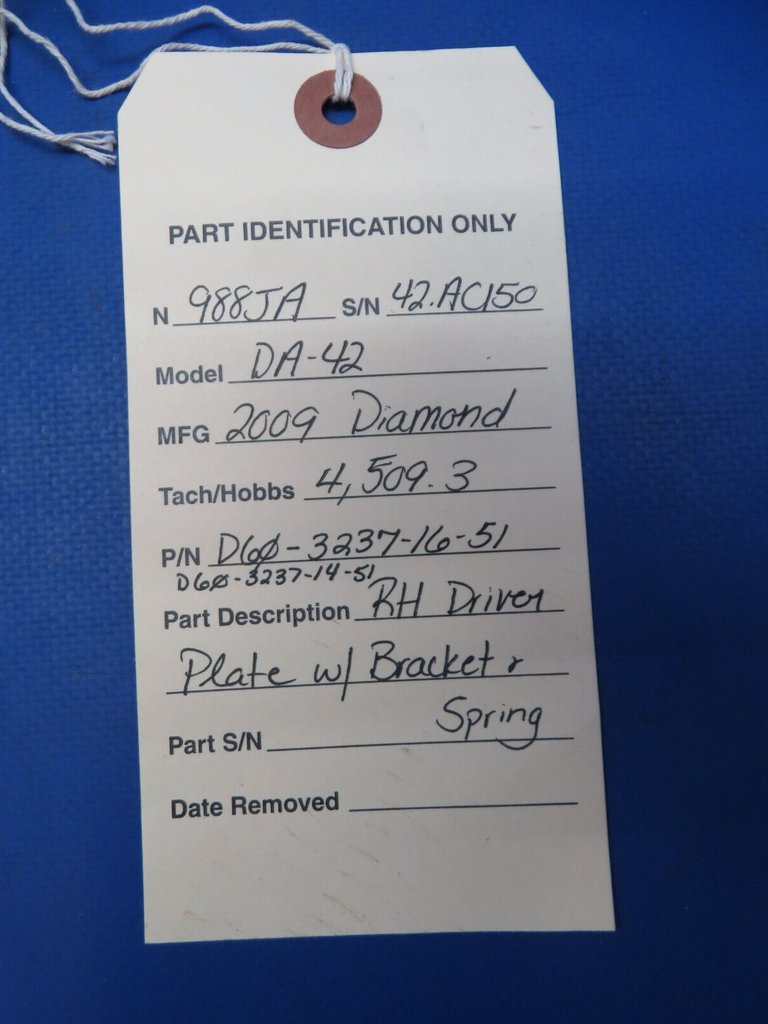 Diamond DA-42 Right Hand Driver Plate w/ Bracket & Spring. P/N D60-3237-16-51. D60-3237-14-51. Removed in good condition from a parted out 2009 Diamond DA-42 N988JA, S/N 42.AC150. TTAF 4,509.3. Guaranteed to pass inspection or your money back.