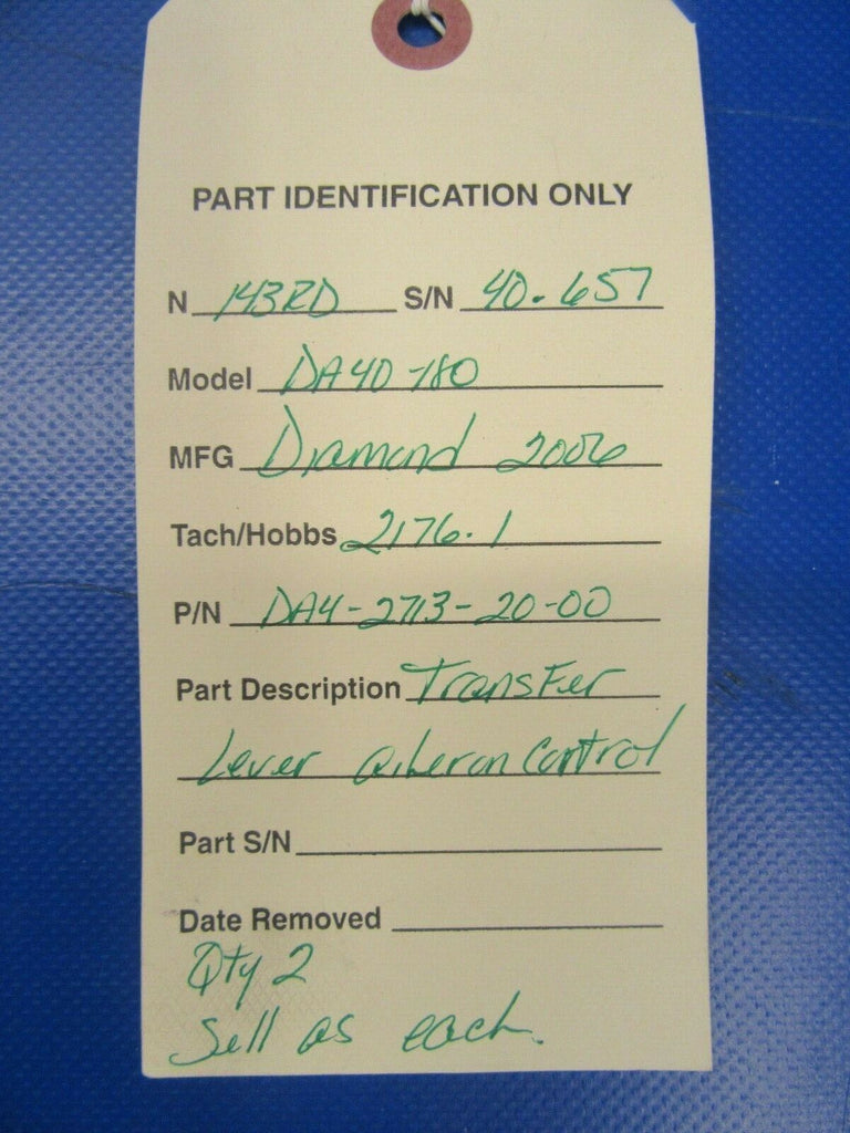 Diamond DA40-180 Transfer Lever Aileron Control. P/N DA4-2713-20-00. Removed in good condition from a parted out 2006 Diamond DA40-180 N143RD, S/N 40.657. TTAF 2176.1. Guaranteed to pass inspection or your money back.