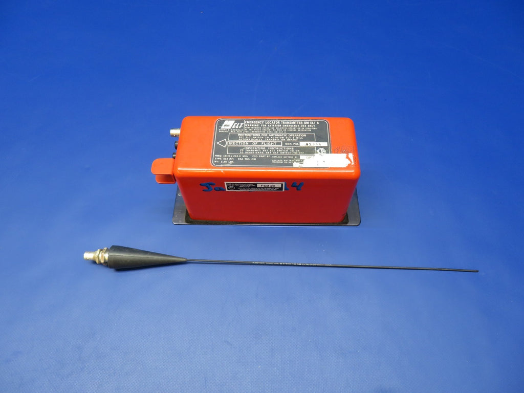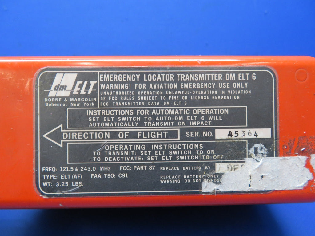 Dorne & Margolin ELT with Antenna. P/N ELT6. S/N 45364. Antenna P/N ELT6.2, C589511-0109. This item was recently tested and found to be in working condition. Removed in good condition from a parted out 1968 Cessna 182L N42175, S/N 1825885. TTAF 3,208.46. Guaranteed to pass inspection or your money back.