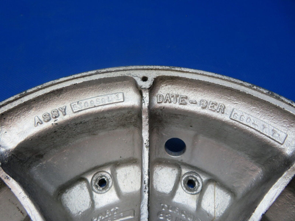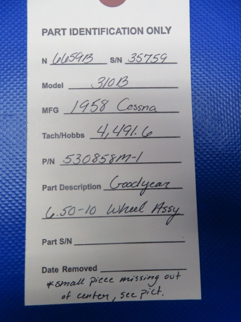 Early Cessna 310 / 310B Goodyear 6.50-10 Wheel Assembly. P/N 530858M-1. Small section of casting dressed out from center, see photos. Removed in good condition from a parted out 1958 Cessna 310B N6659B, S/N 35759. TTAF 4,491.6. Guaranteed to pass inspection or your money back.