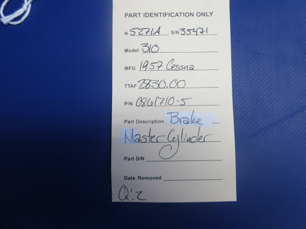 Early Cessna 310 Brake Master Cylinder. P/N 0861710-5. Due to multiple quantities buyer may not receive exact item pictured. Removed in good condition from a parted out 1957 Cessna 310 N5271A, S/N 35471. TTAF 2,830.00. Guaranteed to pass inspection or your money back.