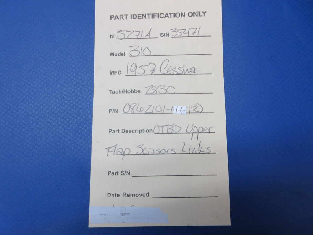 Cessna 310 Outboard Upper Flap Scissors Links. P/N 0862101-11, 0862101-12. Removed in good condition from a parted out 1957 Cessna 310 N5271A, S/N 35471. TTAF 2,830.00. Guaranteed to pass inspection or your money back.